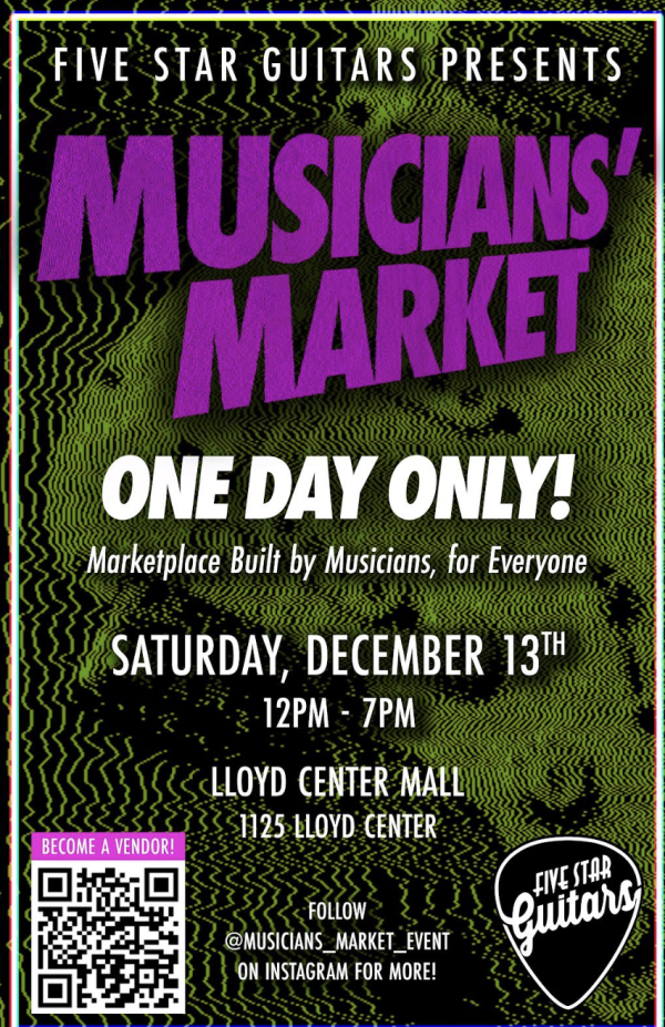 On Saturday, December 13th, 2025, Rhythm Traders will join forces with Five Star Guitars and Oregon Skate Swap to transform Lloyd Center into a Musician’s Market this holiday season. More than 4,000 people attended the last swap, and with holiday traffic, the ice rink, a card collector show, and the mall crawl all happening the same day, this year’s crowd will be even bigger. Plus, cool gear, great prices, giveaways and free stuff.